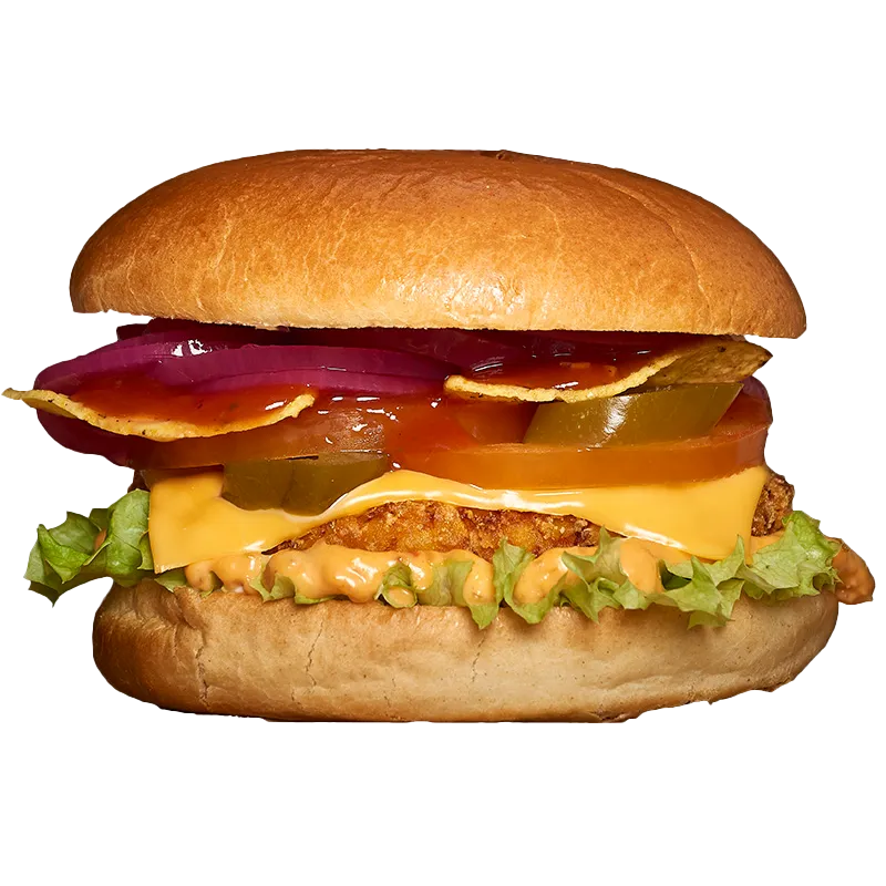 Crispy chicken, salat, løg, tomat, tortilla chips, jalapenos, ost, salsa, burgerdressing.